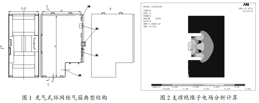 高壓帶電體對地最小間隙處在支撐絕緣子上,通過計算支撐絕緣子的電場如圖2,滿足電場要求,最終確定對地最小間隙。依據最小間隙準則確定氣箱外形尺寸(L1xW1xH1)。