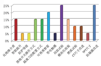 通過調研被參加者心中新產品哪些部分應當進行優化,以為應優化絕緣介質部分的占比15%,智能提升部分的占比5%,防護等級部分的占比5%,接地開關操作方法的占比15%,阻隔刀的配置方法的占比15%;可視觀察窗的占比20%,帶電接觸的占比5%,局放實驗的占比25%,模塊化拼裝的占比15%,燃弧實驗的占比10%CT尺寸改進的占比10%;TPT尺寸的占比5%,防凝露改進的占比25%。如圖15所示。