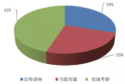 通過了解參加者了解新產品知識的途徑,以為最有用的方法中:宣揚講座的占比30%;能夠通過當面溝通的占比25%;能夠參加實地考察的占比45%。如圖16所示。