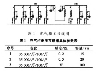 變電站位于高原地區,海拔2100m。變電站選用某公司生產的35kV中壓充氣柜。主接線如圖1所示,其間電壓互感器型號為JDZx-35(AB、C),詳細參數如表1