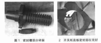 10kV充氣柜作業一段時間后,低氣壓報警主張,斷路器氣室壓力下降,經SF氣體檢漏儀檢測為穿墻套管部分漏氣,拆開穿墻套管后發現密封槽部分碎裂,如圖1所示,開關柜底板密封部位完好,如圖2所示。