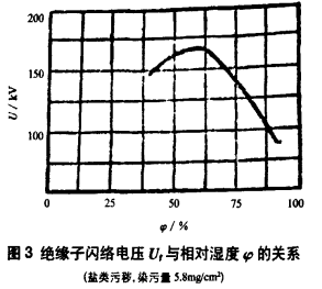 分支箱地處交通要道,背靠山坡,面向公路,塵土很大,絕緣子表面的積塵較多,在污層受潮時(shí)。其中所含可溶性鹽類(lèi)及酸堿等成分溶解于水中,使表面電導(dǎo)驟增,泄漏電流增加,大大降低閃絡(luò)電壓。一般說(shuō)來(lái),絕緣子的污閃電壓隨其污染程度的增加而降低。污染嚴(yán)重時(shí),隨著污染程度繼續(xù)增加,污閃電壓的下降已很緩慢,但這時(shí)污閃電壓常常已經(jīng)低于工作電壓了。干燥污穢的電阻較大,它并不降低絕緣子的閃絡(luò)電壓,一般當(dāng)空氣相對(duì)濕度小于50%~70%時(shí),沿面閃絡(luò)電壓不會(huì)降低;高于這數(shù)值時(shí),隨著濕度增加,閃絡(luò)電壓迅速下降,如圖3所示。實(shí)際運(yùn)行中,絕緣子污閃事故都發(fā)生在霧、露、陰雨綿綿等高濕度的天氣.因?yàn)樵谶@種條件下、積塵中水深性的鹽類(lèi)溶解,使污層成為半導(dǎo)體層,大大增加匯漏,降低閃絡(luò)電壓。本次事故正值重慶百年不遇的大雨期間,而開(kāi)關(guān)柜體的密封較差,柜內(nèi)相對(duì)濕度已達(dá)90%以上,開(kāi)關(guān)柜的操作機(jī)構(gòu)機(jī)構(gòu)嚴(yán)重腐蝕,以至于完全不能正常操作,由臟污沿面放電的過(guò)程的討論可知,污層的電阻越大,泄漏電流越小,放電發(fā)展越困難,閃絡(luò)電壓也相應(yīng)提高。在同樣污染和潮濕條件下,介質(zhì)表面形狀、兩極間的沿面最短距離即泄漏距離是影響表面電阻和閃絡(luò)電壓的重要因素。泄漏距離增加,污閃電壓也增加。不同的污穢情況對(duì)線(xiàn)路及變電站絕緣的影響程度是不同的,因此應(yīng)根據(jù)不同的污移情況,采取相應(yīng)的絕緣標(biāo)準(zhǔn)保證電網(wǎng)安全運(yùn)行"。目前, 我們用泄漏比距來(lái)估計(jì)臟污條件下絕緣子的耐污性能。由于我局所轄電網(wǎng)為渝中區(qū),被定為三級(jí)污區(qū),按變電站設(shè)備考慮泄瀾比距應(yīng)大于4cm/MkV。