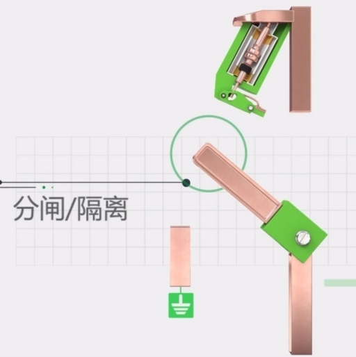 當(dāng)電流開斷終了后,動(dòng)觸頭開釋樞軸桿,并使其繼續(xù)旋轉(zhuǎn)至阻隔方位。在緩沖繃簧的作用下,樞軸桿回來初始方位,然后閉合真空滅弧室。