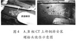 斷路器氣室內(nèi)部PT阻隔開(kāi)關(guān)A相動(dòng)觸頭變形,未搭在接觸銅排上,端頭有顯著炙烤痕跡;B相動(dòng)觸頭端頭有燒傷痕跡;A相CT旁氣室壁有顯著燒傷痕跡;A相和B相CT上部銅排設(shè)備螺栓頭燒傷,斷路器室頂部方位有電弧燒傷痕跡,如圖4所示。